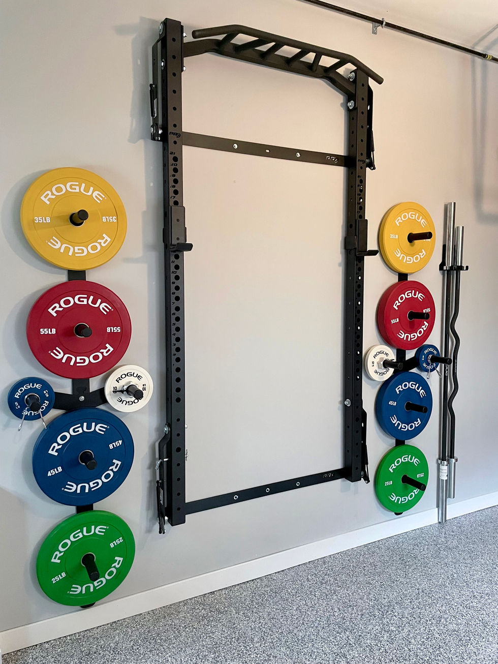 - Compact wall-mounted storage – Storing barbells, plates, and accessories neatly, maximizing floor space.